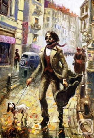 выступление, на концерт его верная поводырь-собачка внимательно смотрит за правильностью шагов хозяина и его безопасность...